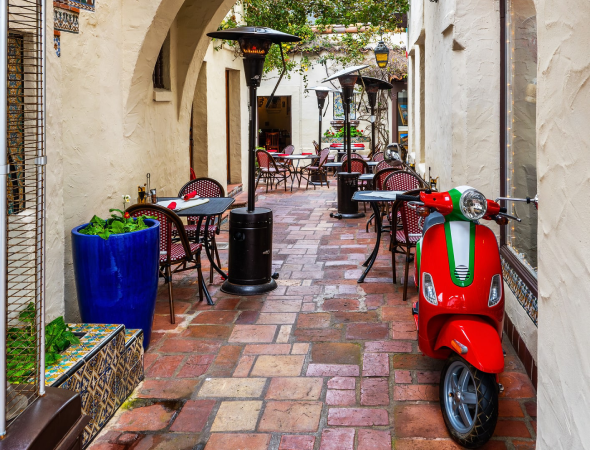 Alleyway view of boutique shops in Carmel-By-The-Sea, California.